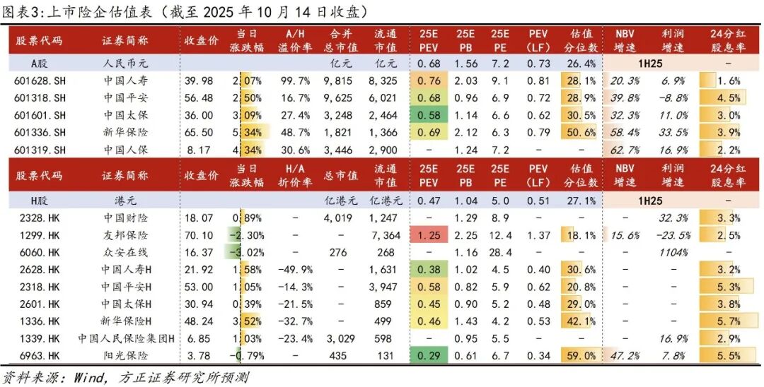 净利润/净资产:权益市场改善提振投资和利润,3Q25利率上行有望缓解净资产压力。①权益市场上涨推动利润高增:3Q25单季沪深300上涨17.9%,好于上年同期的16.1%,并且算力AI、科技等成长表现较好,带动公司投资收益和利润继续提速;其中新华已经发布业绩预告,单季利润yoy+58.2%~101.3%,预计其他公司单季利润亦将保持双位数增长。②利率单季上行有望缓解净资产压力:3Q25 10年期国债收益率+21.4bp、红利指数-3.44%,使债券贬值、OCI股票公允价值下跌拖累净资产表现,但负债规模较大、久期较长,预计将较好的对冲上述拖累,净资产压力或有所改善。