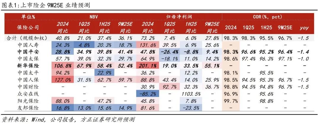 上市险企9M25E业绩核心指标预测: